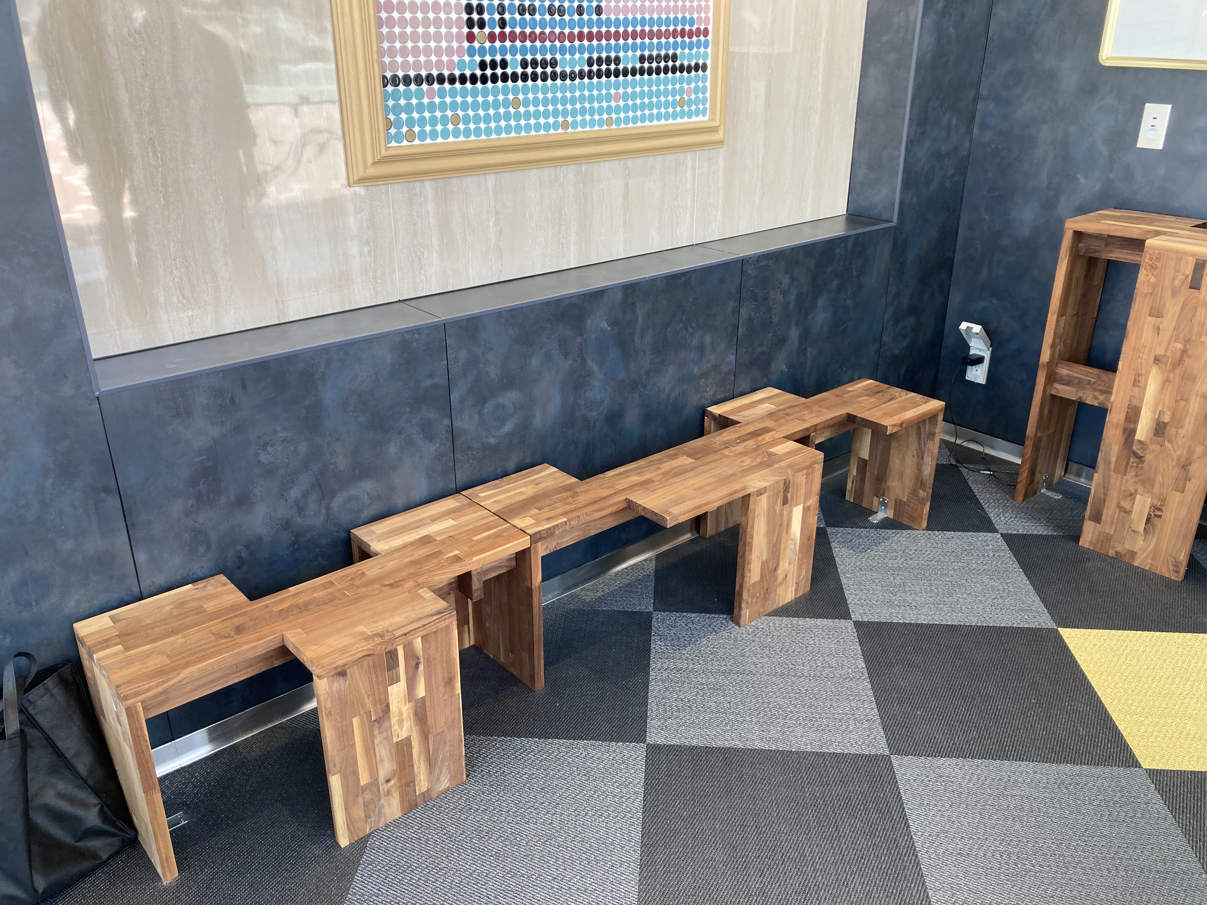 ・本巣のアルファベット「MOTOSU」をかたどった屋外ベンチや、木のぬくもりを感じる室内ベンチ(リテラシー教育活動で制作:指導今田教員)
