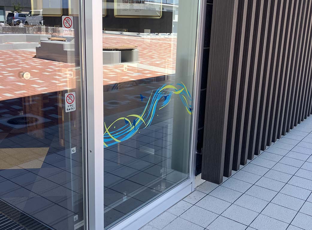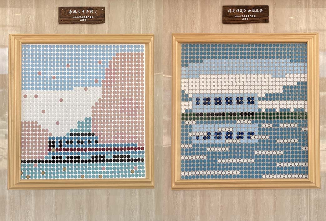 ・本巣地域の「水・樽見鉄道・桜」をイメージしたモザイクタイルの壁画や、ガラス扉のデザイン(美術部が制作:指導櫻木教員)