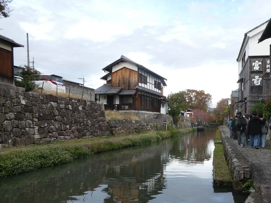 見学ルートでは、江戸時代から続く町並みが今も残る通りを歩き、白壁の町家や格子戸の家々が連なる落ち着いた景観を体感しました。石畳の道を進むと、琵琶湖へとつながる「八幡堀」が姿を現し、ゆったりと流れる水面と歴史的建築が調和した独特の風景が広がっていました。堀沿いには蔵や町家が並び、かつて商人たちが舟運を利用して栄えた当時の面影を感じることができました。