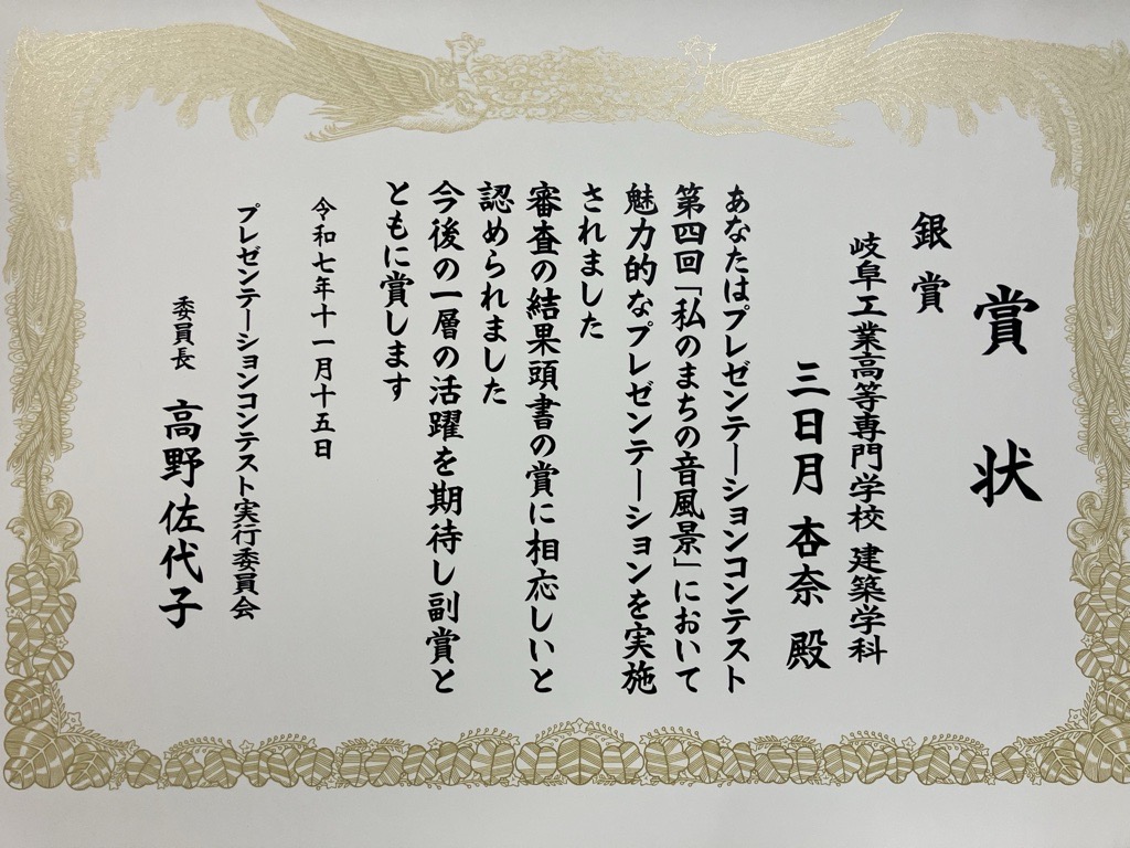 【学生】第4回プレゼンテーションコンテストで建築学科1年の三日月 杏奈さんが銀賞を受賞