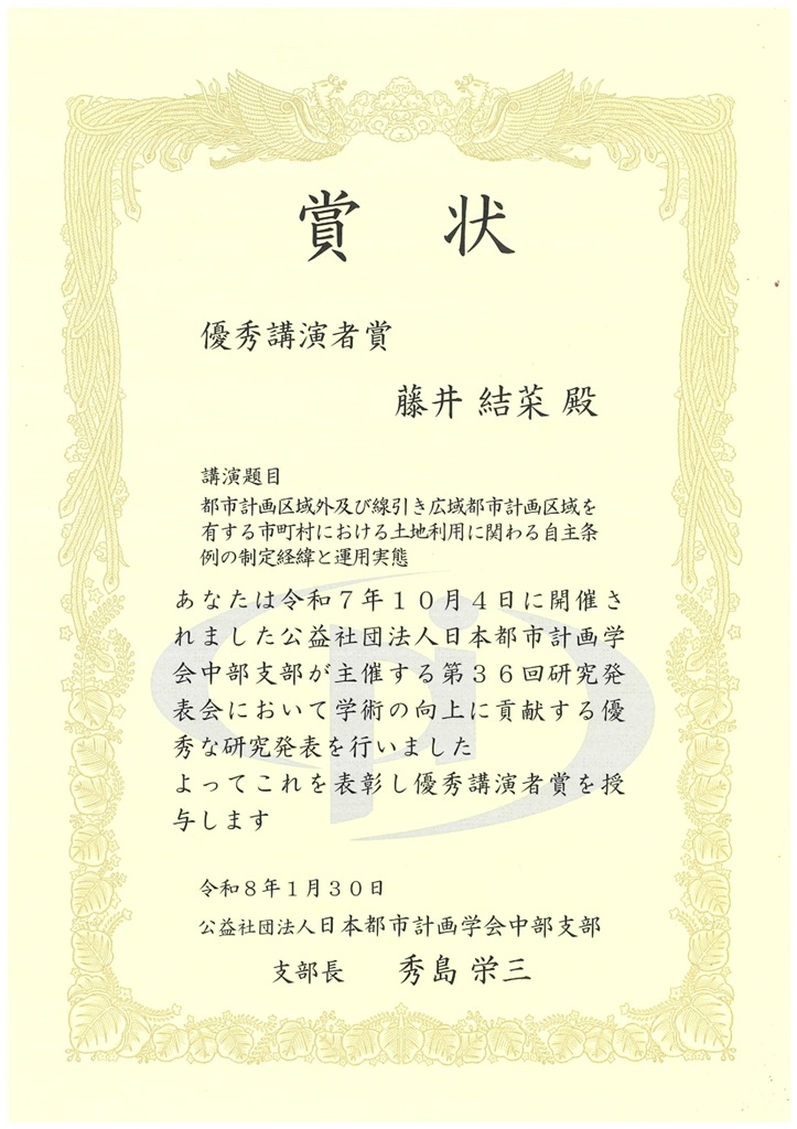 【学生】専攻科1年 藤井結菜さんが第36回都市計画学会中部支部研究発表会で優秀講演者賞を受賞 専攻科先端融合開発専攻1年の藤井結菜さん(建築学科鶴田研究室所属)が、2025年10月4日に金沢大学で開催された第36回都市計画学会中部支部研究発表会において発表を行い、優秀講演者賞を受賞し、2026年1月30日に公益財団法人名古屋都市センターにて表彰式が行われました。 発表題目は「都市計画区域外及び線引き広域都市計画区域を有する市町村における土地利用に関わる自主条例の制定経緯と運用実態」です。