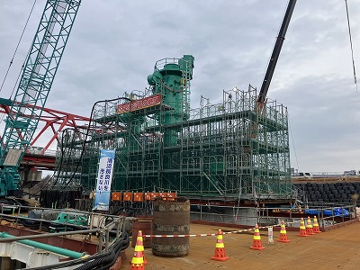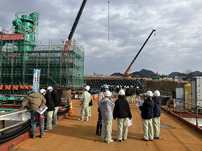 見学では,新藍川橋の整備目的,下部工のユニークな施工方法であるニューマチックケーソン工法の説明をいただくとともに,実際に重機の稼働状況を間近で見学することができました.