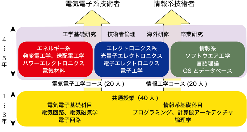 これらのコースは単に電気電子工学、情報工学の科目を修めるコースではなく、情報技術も駆使できる電気技術者、 あるいは電気電子工学に精通した情報技術者の育成を目指しています。