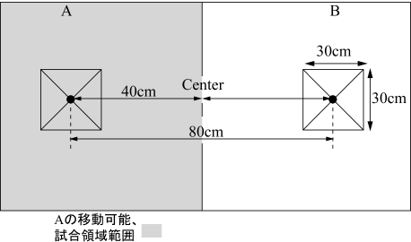 - マシンは30cm×30cm、高さ20cm以内で、図1の競技フィールドの接地場所において競技を始める。紐の長さは90cmである。