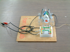 稲葉研 ソレノイドで紐を一気に引っ張り、その後ソレノイドから出た重りで回路が切り替わり、モータで引っ張る2段式。当日は、調子が悪かった。 |