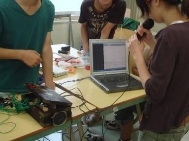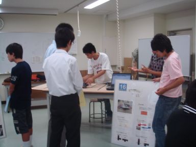 ここでは学生が作った作品を紹介します。作品は8/30に開催されたオープンキャンパスにすべて公開しています。また、第4学年の工学基礎研究の作品も公開しています。説明の(4E)は工学基礎研究、(5E)は電気電子工学実験、情報工学実験を意味します。見学会では、スタンプラリーによって作品を見ていただき、優れた作品を3つ選んでいただきました。その結果を公表します。