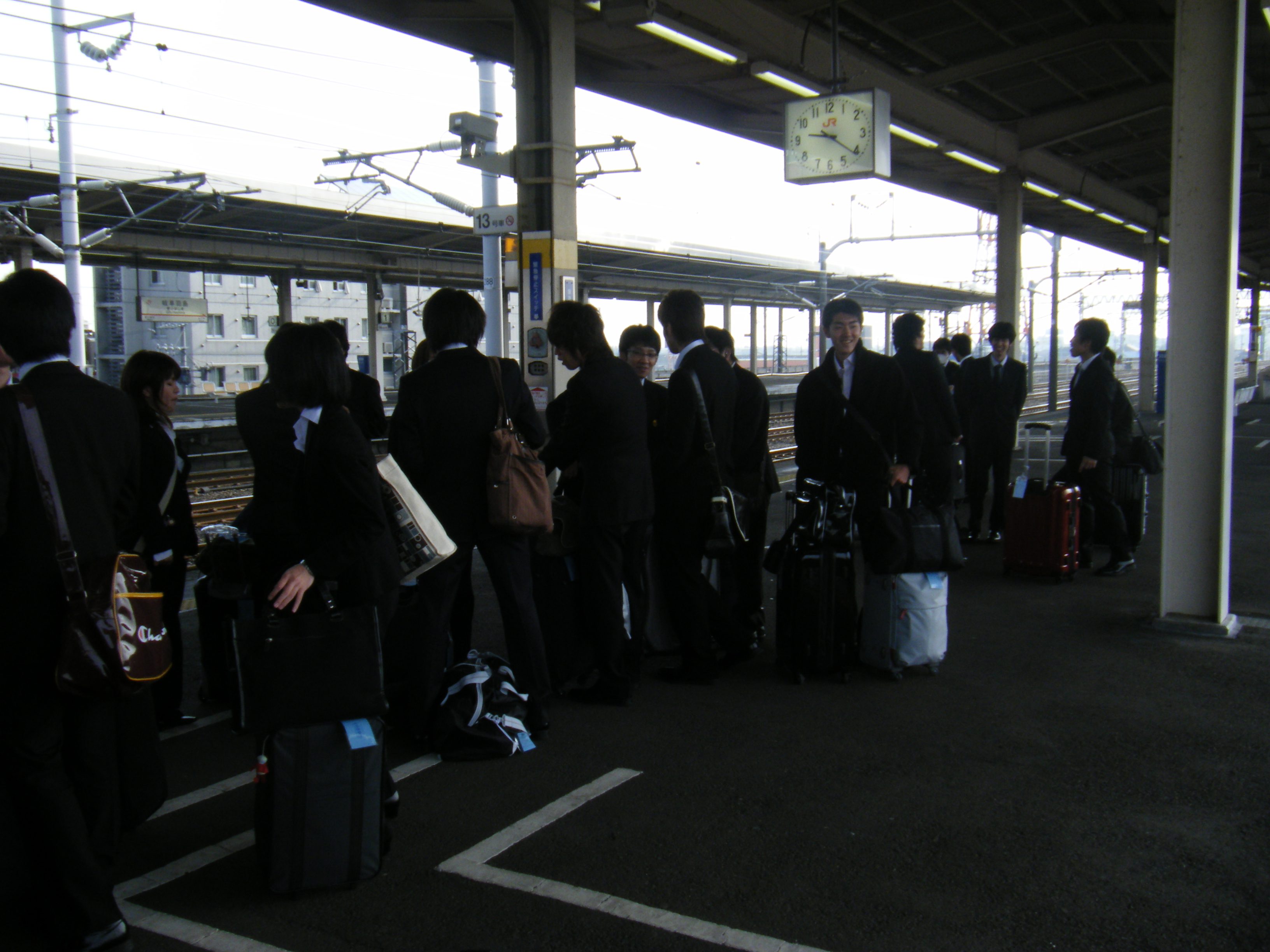 当初、穂積駅の南側ロータリーで穂積組を載せる予定で8時20分集合8時30出発の予定でした。前日に名鉄観光から急に連絡があり、駅前は渋滞するので市役所まで出てきてほしいとのことでした。今変えるのも混乱するとは思いましたが、変更の連絡をして一応全員から確認の連絡を受けました。しかし、突然の変更で不安は増すばかり。特に、携帯電話をもっていない学生が2名含まれているので、市役所がわからないと大変だと思いました。学生は穂積駅は知っていても、瑞穂市役所なんて知らないのが普通ですから・・・。市役所付近まで来て何人か集まっているのを見てほっとしましたが、着いてみれば5人ほどいない・・・。ほかの学生に聞くと、駅の北側の方に行った学生がいるという。ここで遅れると羽島で新幹線に乗り遅れてしまう・・・。添乗員が北の方に歩いて確認に行く。私は、ちょっと予感があって南の通りに出て東の方に行くと、背広を着た見慣れた5人がこちらへ歩いてくるではありませんか。やったー。8時20分には出発することができました。羽島駅に向かいます。車中で添乗員を紹介しました。学生にはイケメンの若い添乗員だと紹介してあったのでみんな興味シンシンです。羽島駅で合流し、全員がそろいました。さて、全員で大阪方面のプラットホームに立ち指定された13号車付近で待ちます。乗り込むのに時間がかかるので前方からと後方からの二手に分かれて並んでいました。さて、ひかり号がいよいよ入ってきました。これに乗ってしまえば一安心。13号車が前で止まりました。あれれ、満員だぞ?!
