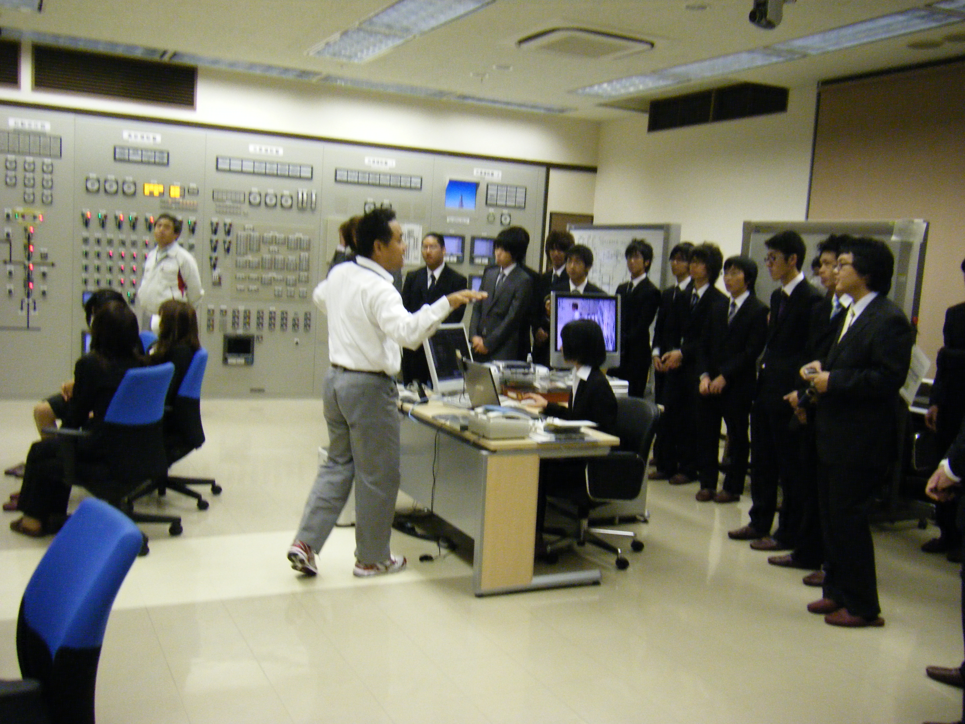 最初は電源開発(J Power)若松事業所で工場見学です。中部電力や九州電力の見学経験はありますが、電源開発は初めてで、私も副引率のT先生(電力がご専門)も興味シンシンです。新たな発見もあり、また、熱の入った事故の復旧シュミレーション等、大変に貴重なものでした。非常に綿密に計画し準備された内容でした。