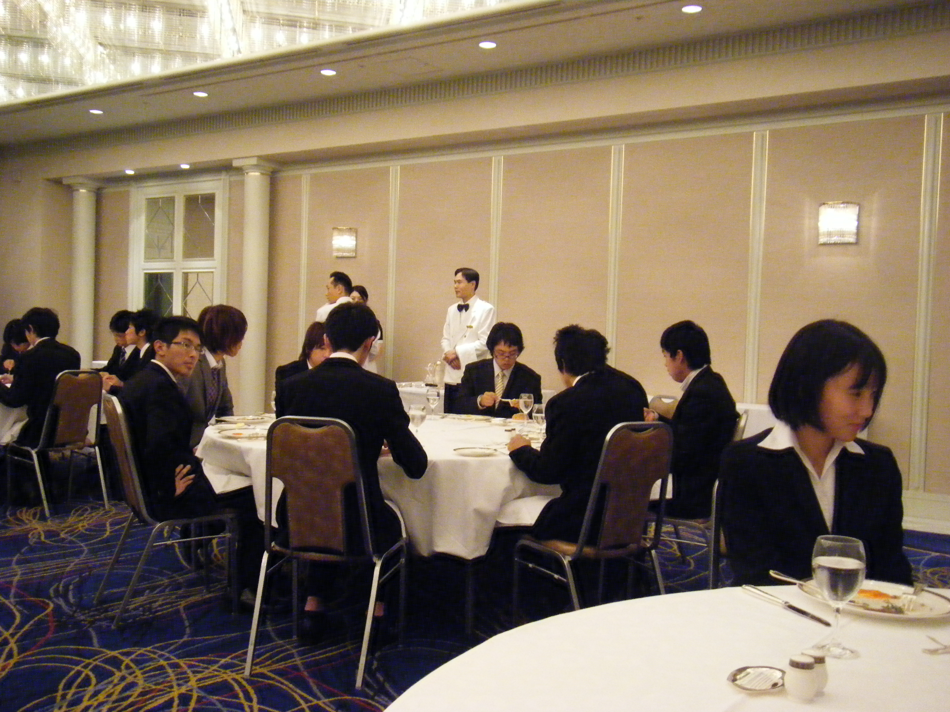 これまでに何回もテーブルマナーを受けていますので、私は慣れたものなのですが。2年前に北海道で受けた時は少し驚きました。食べ終わるとフォークとナイフは皿の向こう側に横にして置くように覚えていたのですが、斜め45度に置くように言われました。講師も私を意識して、年をとった!方は横に置くように習ったと思いますが、今は45度ですといわれ、時代とともに変わっていくんだなあととても、新鮮に思い、よく覚えていました。さて、今回の講師はホワイトボードに横向きに描いています。早速、ウェイトレスを呼び、質問を講師に伝達してもらいました。英国式とフランス式で違うなどといろいろ説明を加えていましたが、結局斜めに書き直されました。エッヘン。