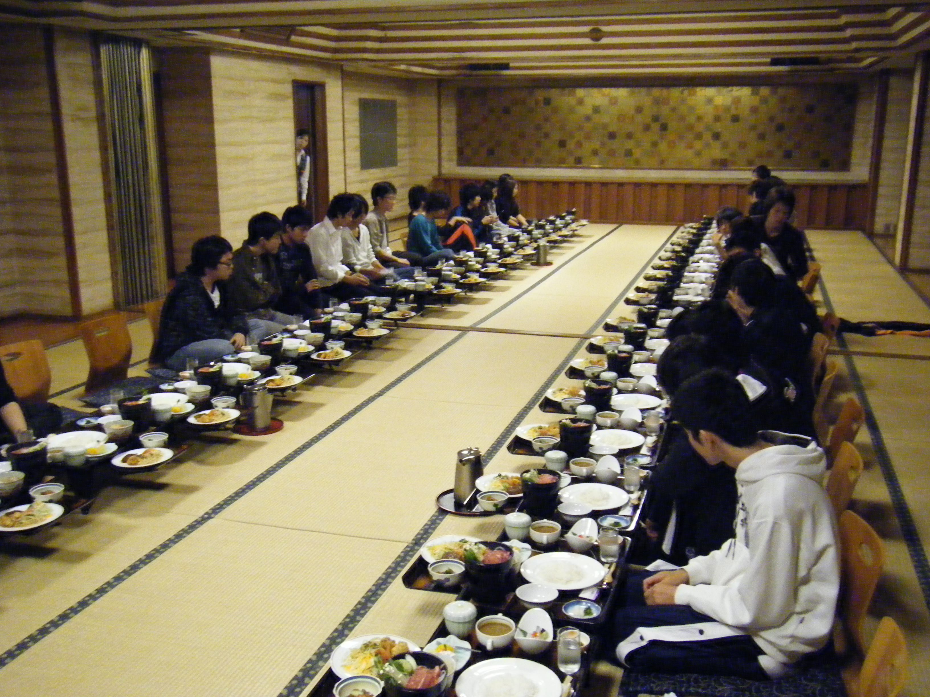 効果てきめん!急にピタッとおさまった。が、突如大きく響き渡るバタン!の音。すぐ前から聞こえたから副引率のT先生の部屋か。それ以後シーンとしてこれは効き目がありすぎたかな、と思いながら深い眠りに・・・。  バタン!誰だ!せっかく気持ちよく寝入っていたのに、むかっとして飛び起き、「何時だと思っているんだ」と時計を見ると午前6時52分!朝だ!アラームの音も聞こえなかったのか。あのバタンがなければ完全に寝すぎるところだった・・・。あわてて朝食会場へ。