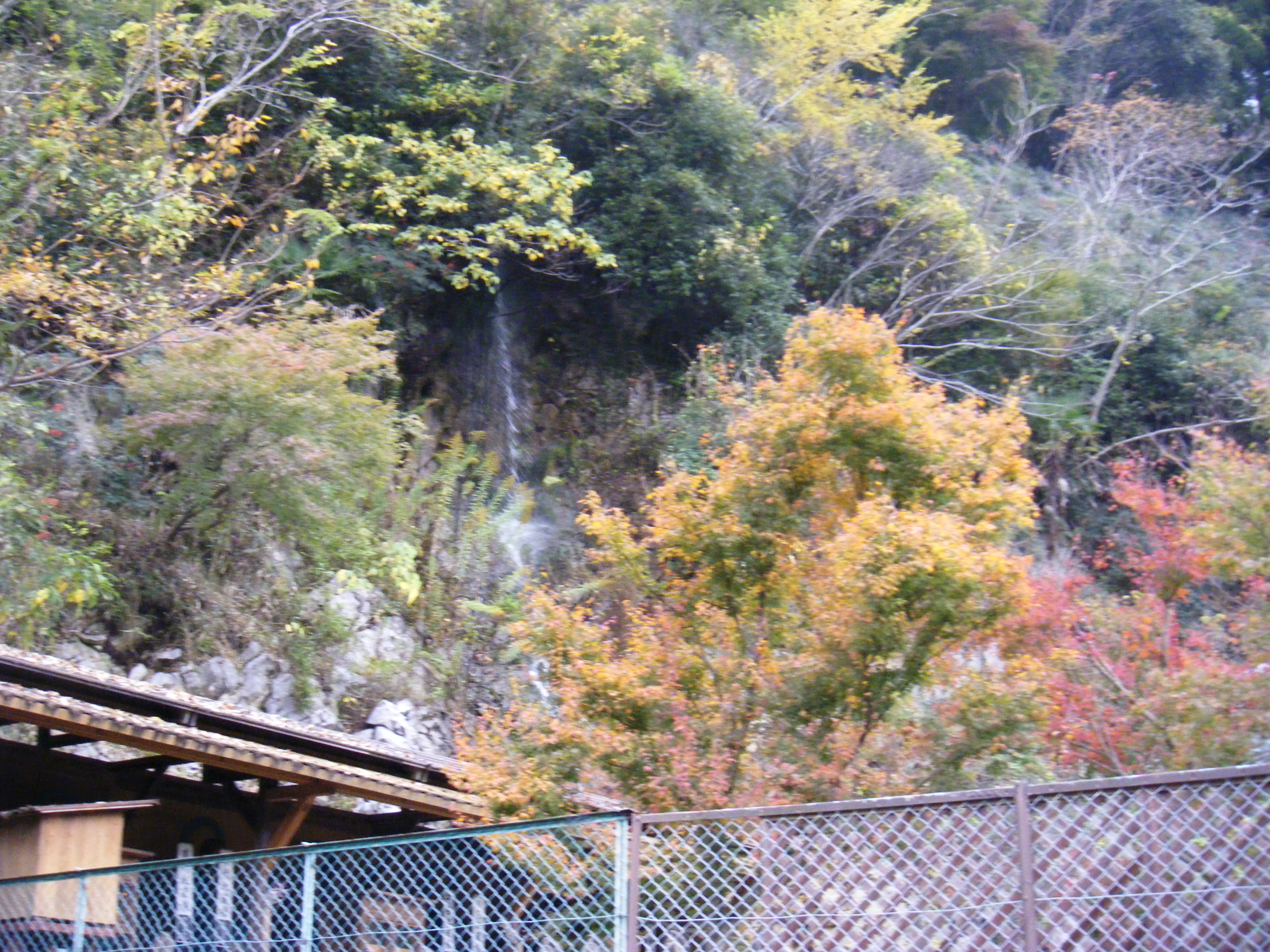 やっと駐車場に着きました。広い!こんなにたくさん来るのだろうか。でもバス用の駐車場はないぞ?バスガイドさんが真っ先に入っていきます。天然記念物で日本最大の水中鍾乳洞!秋芳洞は高校の修学旅行で40年以上!も前に行ったことがあるが水中ということは、鍾乳洞が池の下にあるのだろうか。何となく怖いぞ。入口の滝と紅葉がきれいでした。中に入って分かりました。鍾乳洞が下部が水中にあり、水の上に通路が作られているのです。基本的に水の上に作られた通路を通って上の鍾乳洞や下の深い深い水中を見学していくのです。どこまで深いのか全く分からない深い深い水深部もある。覗き込むと神秘的な青さが印象的で、怖い感じがします。デジカメを落としたら絶対にだめだろうなと思い、思わずストラップを握りしめます。通路な大変な長さです。時間内に帰ってくることができるのか、迷子になったらどうしょう。ここで地震が起こったらパニックだなと思うと、写真を撮るのもそこそこに帰りはダッシュで帰ってきました。全員そろったところで出発。店の人たちが総出で見送りをしてくれます。いいところだった。来てよかった。こちらも笑顔で手を振ります。ぐるっと周回して川を挟んだ向こう側にでてもまだ、手を振ってくれています。大分の人たちはいい人たちだ。すごい迫力のあるところだし、また学生を連れて来たいものだ・・・と思いました。行きに工事していた個所や断崖を通るころには、すっかりその考えはなくなっていました。
