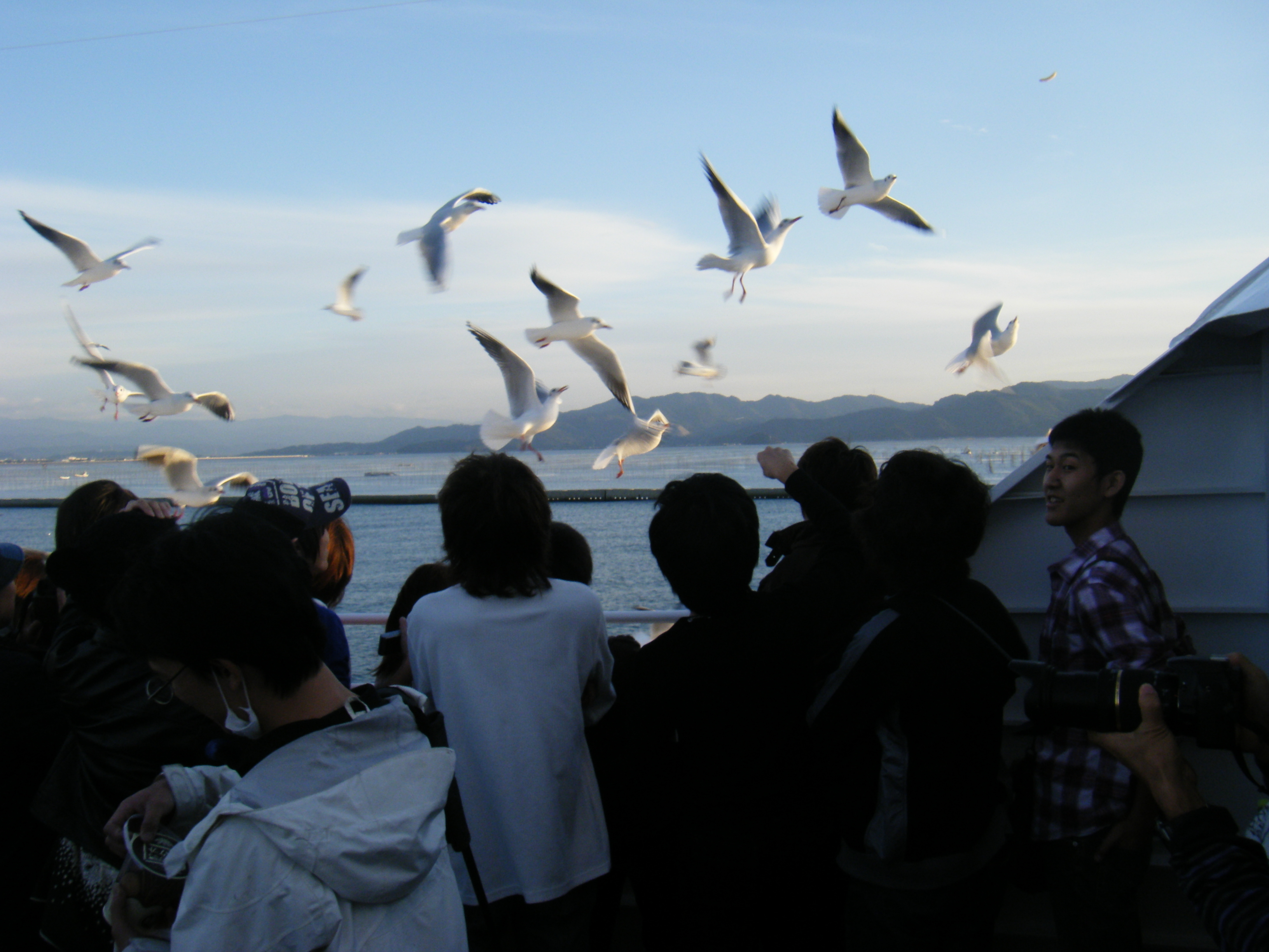 私と一緒に見ていた学生のS君が天守閣にも行くという。間に合うだろうか・・・。駐車場に戻ると添乗員さんと運転手さんとバスガイドさんが心配そうにしている。日の丸団体が誤算だったらしい。それまで、いつも集合3分前には出発できていたが、S君が間に合うだろうか。駐車場の端で待つが1分前でもまだ影も見えない。S君の携帯をならす。「いまどこだ!」「もうすぐ着きます。今は走ってます。」「後ろに誰かいるか」「いま二人抜きました!」S君ぎりぎりで到着。あと二人。走ってくる。2分遅れで出発。どこかで渋滞にあったら終わりだ。バスは猛烈な速度で走る。一本道に出た。どうやらバイパスがあるらしい。信号で止まるとイライラする。正面に雲仙普賢岳が見える。もうそろそろのはずだがなかなか見えない・・・。着きました。間に合いました。16時20分着。本当なら20分前についていなくちゃいけないんだそうです。我々を待っていたかのように、ほかの車が乗り込み始めました。フェリーが初めての学生もかなりおり、船酔い等心配そうです。デッキに出られるから気持ちがいいよと安心させました。デッキでのカモメのえさやりです。今日一番の盛り上がりでした。カモメもたいへんだなあ。このまま、島原までついてくるのだろうか。