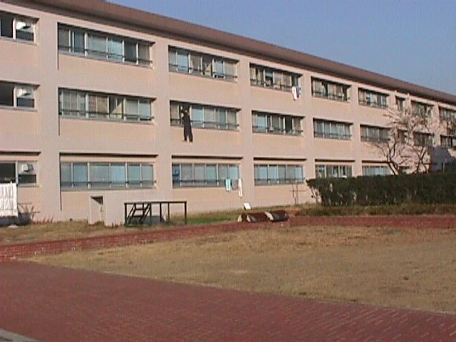 窓をふくC寮生ひとり その下には 全寮朝礼で使う 朝礼台 その右横には バーベキュー大会の ドラム缶が